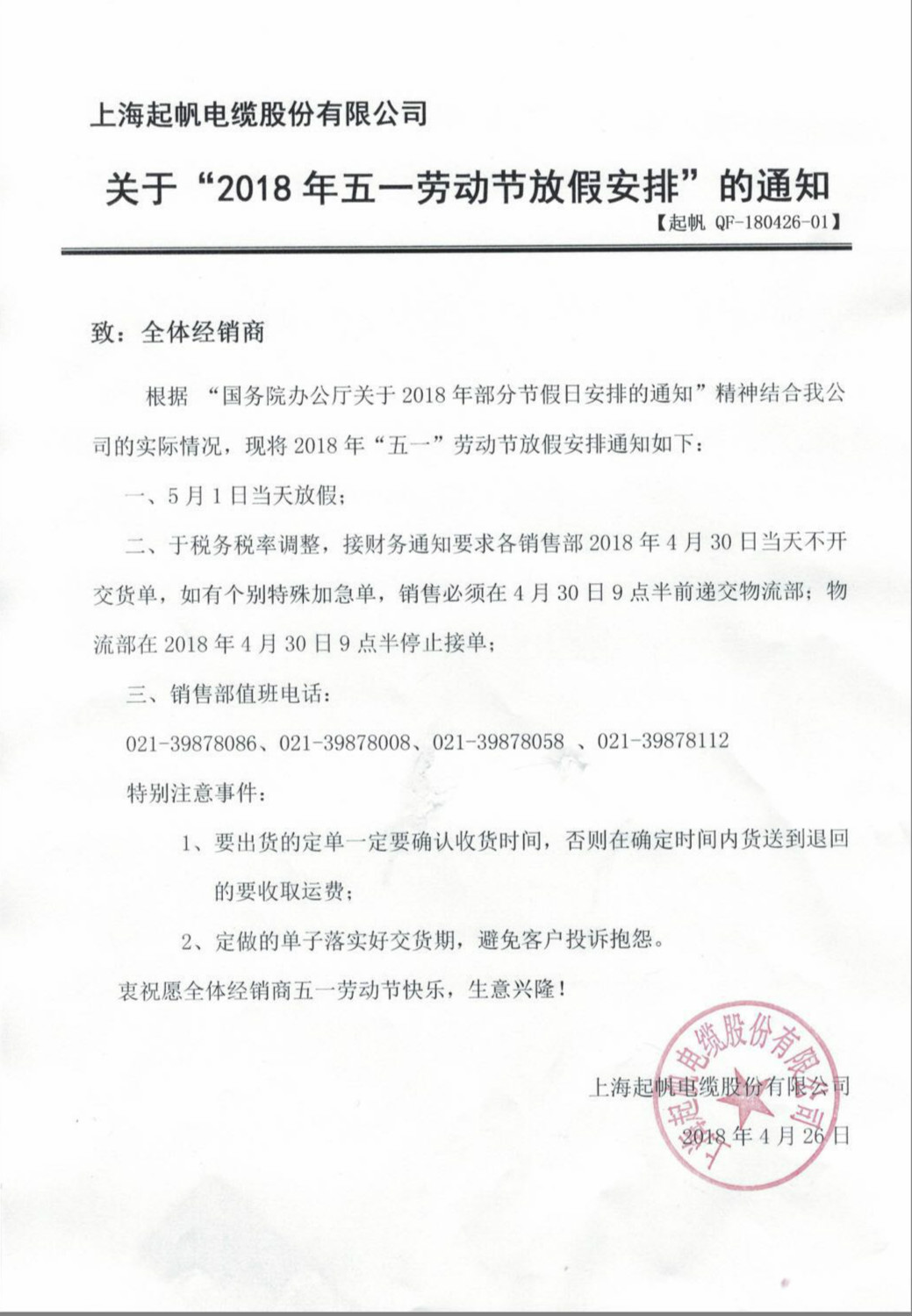 起帆電纜放假通知及5月份稅務稅點調整告知