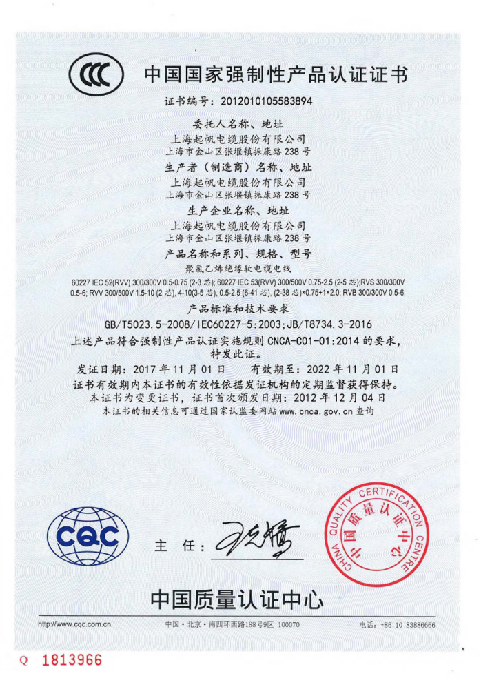 中國國家強制性產品認證證書RVV聚氯乙烯絕緣軟電纜電線