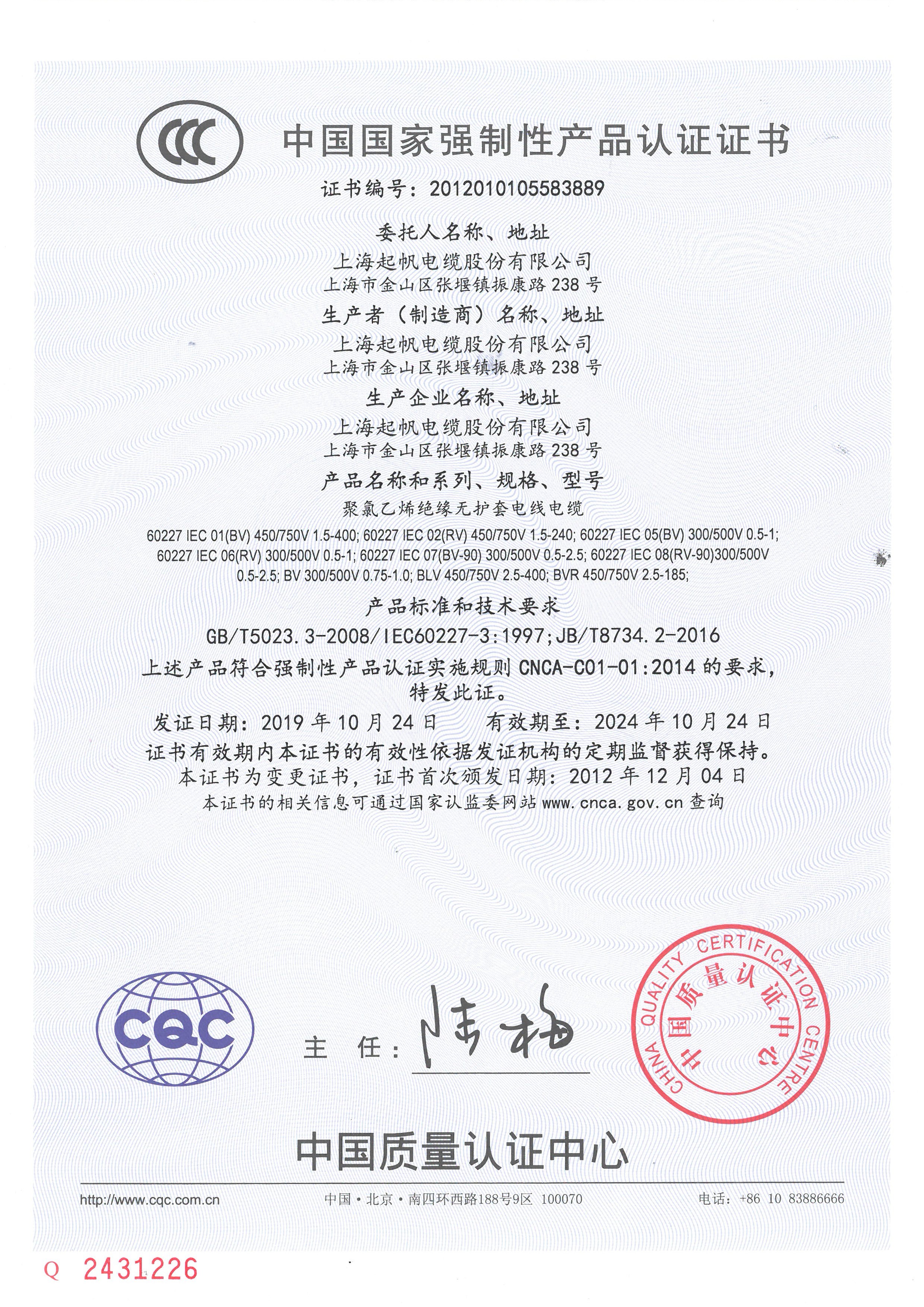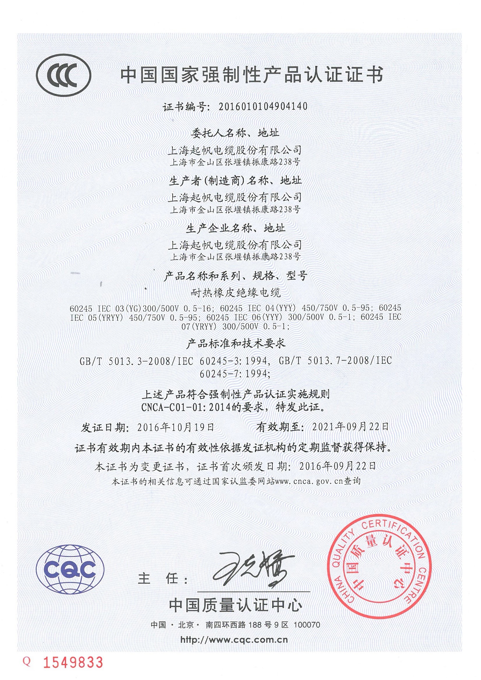 中國國家強制性產品認證證書YG橡皮絕緣電纜
