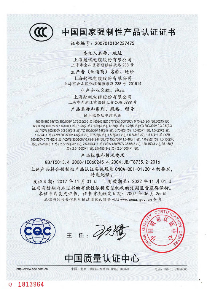 中國國家強制性產品認證證書YZ橡套軟電線電纜