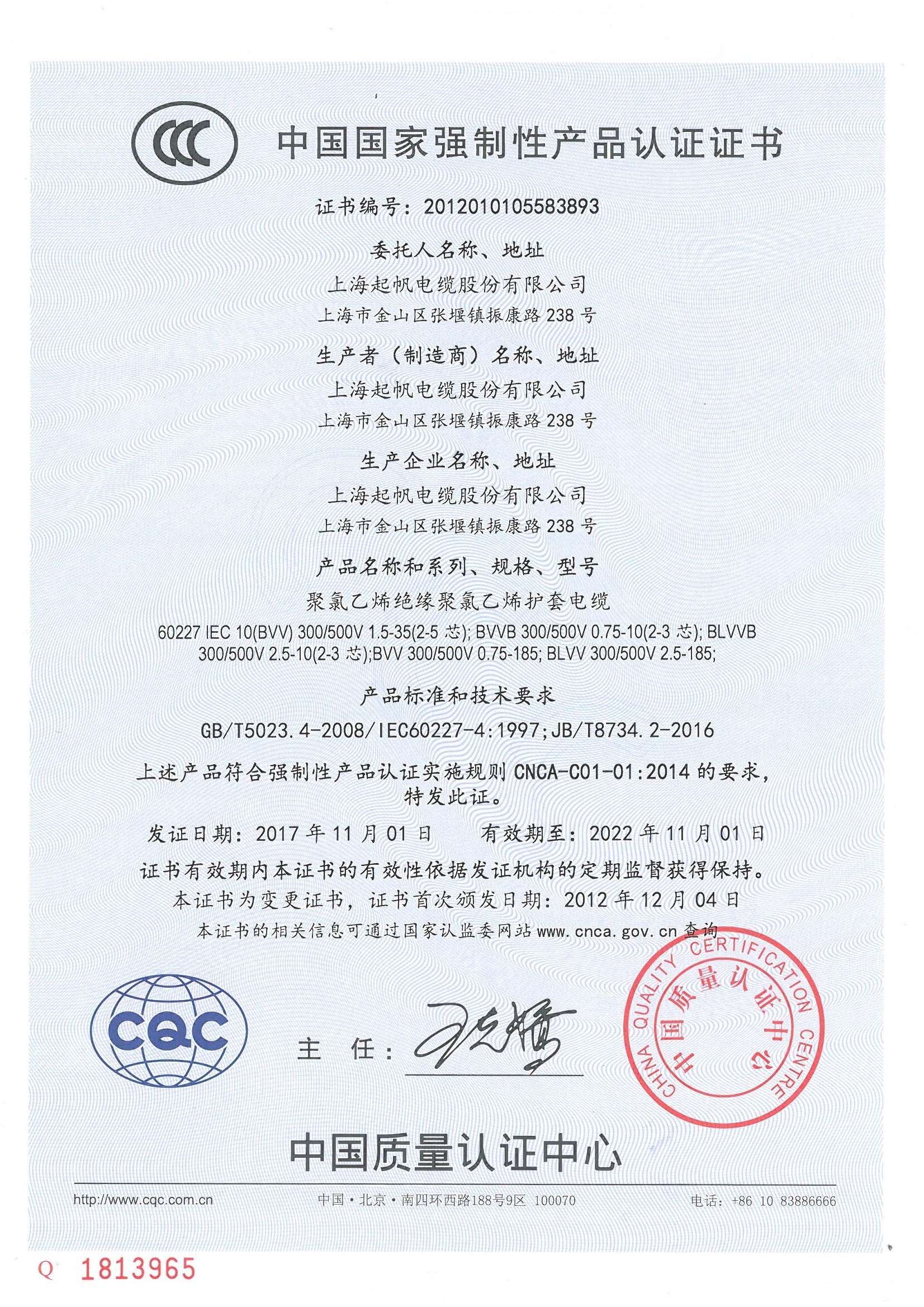 中國國家強制性產品認證證書BVV聚氯乙烯護套電纜